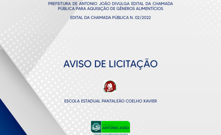A Prefeitura de Antonio João divulga o edital chamada Pública que tem por objeto a aquisição de gêneros alimentícios da Agricultura Familiar e do Empreendedor Familiar Rural ou suas organizações, especificados no ANEXO A – ESPECIFICAÇÃO DOS GÊNEROS ALIMENTÍCIOS deste Edital, para atendimento ao Programa Nacional de Alimentação Escolar (PNAE) para Escola Estadual Pantaleão Coelho Xavier.
