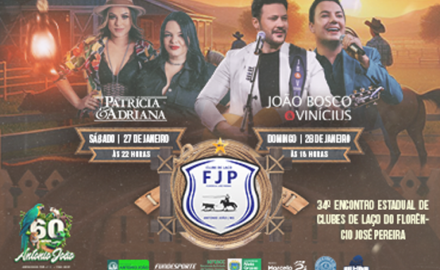 Os preparativos estão a todo vapor para o 34º Encontro Estadual de Clubes de Laço, que promete ser a primeira grande festa do ano em Antonio João. Com início no dia 25 de janeiro, o evento contará com shows gratuitos, disputas acirradas, praça de alimentação, exposição de máquinas, insumos, carros e diversas oportunidades de negócios.