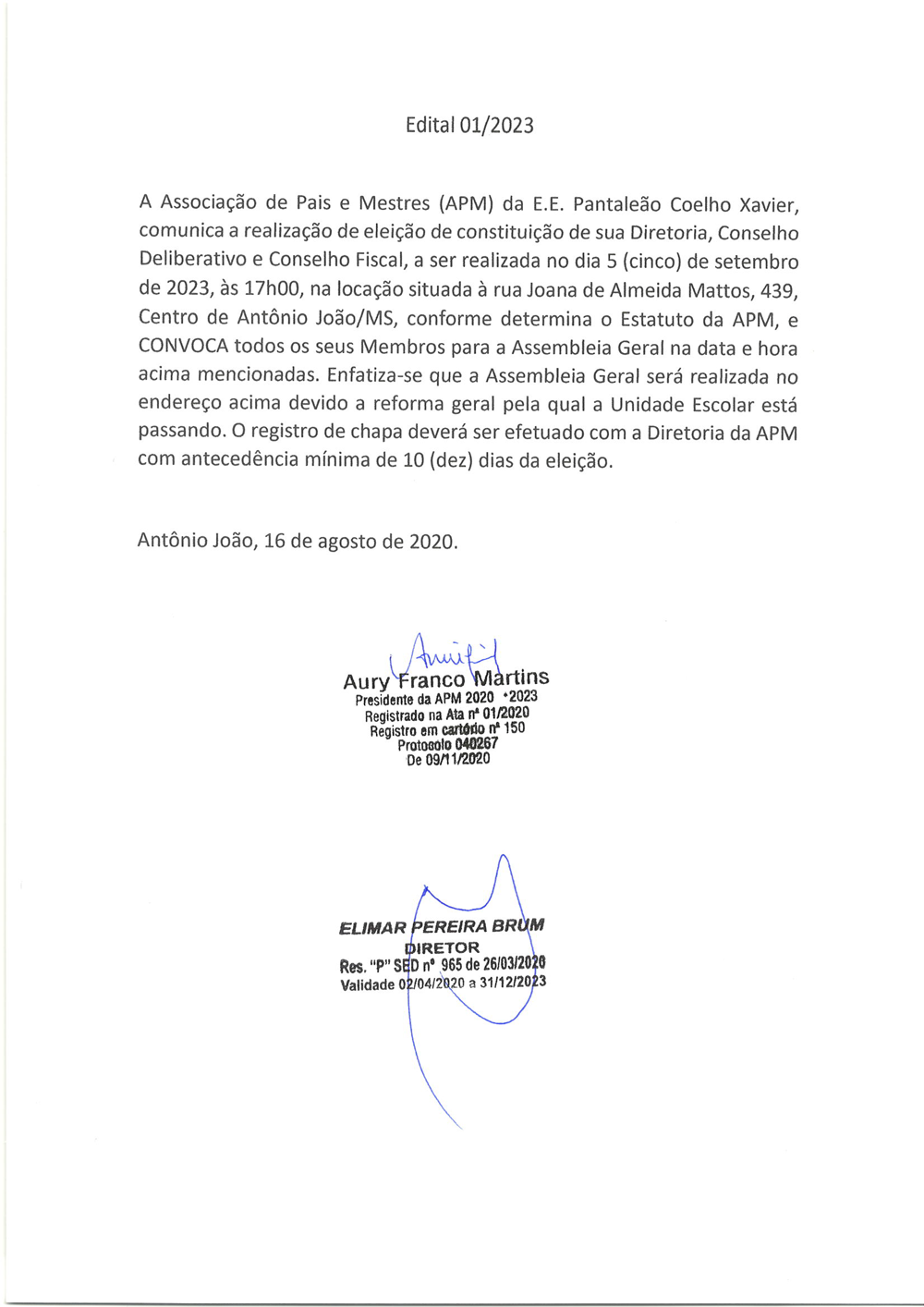 A Associação de Pais e Mestres (APM) da Escola Estadual Pantaleão Coelho Xavier, em uma demonstração de comprometimento com a gestão participativa e o aprimoramento contínuo da comunidade escolar, comunica a realização das eleições para a constituição da nova Diretoria, Conselho Deliberativo e Conselho Fiscal. O evento está marcado para o dia 5 de setembro de 2023, às 17h, na locação situada à rua Joana de Almeida Mattos, 439, no Centro de Antonio João - MS.